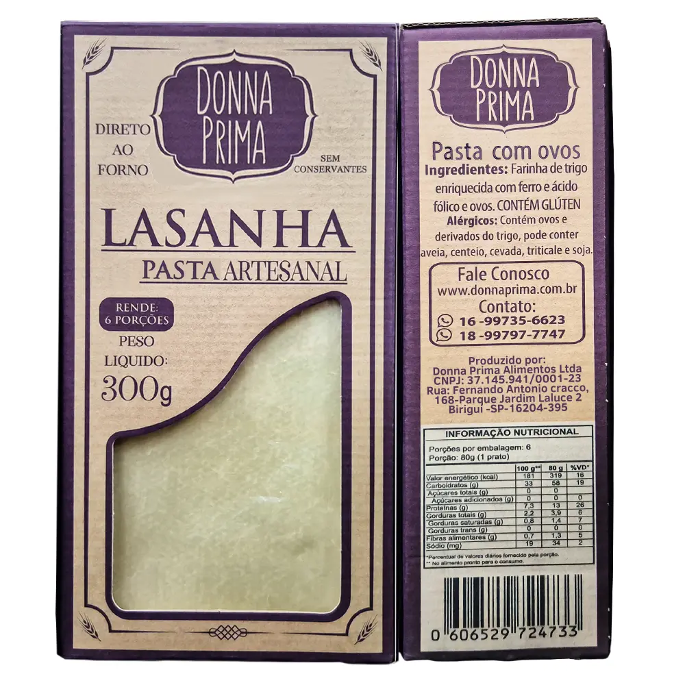 Pasta Artesanal para lasanha, extra fina, feito com ingredientes de alta qualidade, prazo de validade 1 ano “sem conservantes” podendo levar direto ao forno, com tempo de cozimento de 15 a 20 minutos