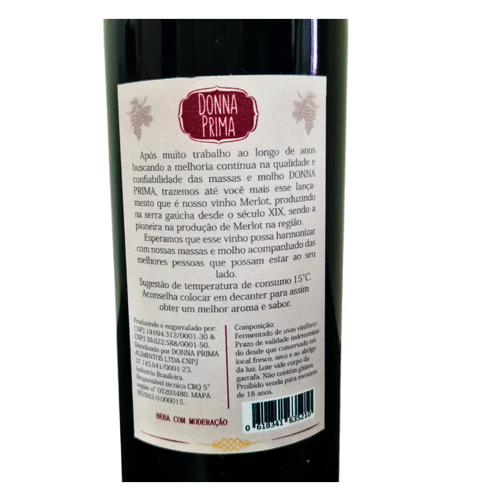 Após muito trabalho ao longo de anos buscando a melhoria contínua na qualidade e confiabilidade das massas e molho DONNA PRIMA, trazemos até você mais essa novidade que é nosso vinho Merlot, produzido na serra gaúcha desde o século XIX, sendo a pioneira na produção de Merlot na região. Esperamos que esse vinho possa harmonizar com nossas massas e molho acompanhado das melhores pessoas que possam estar ao seu lado.